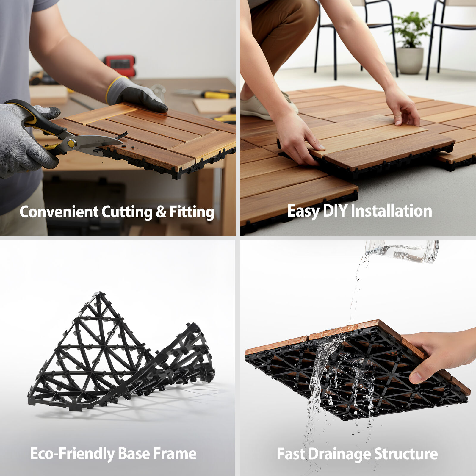 - Fast-Drainage Raised Base - Hollow raised design allows quick water drainage and improved airflow for longer-lasting outdoor wood flooring.