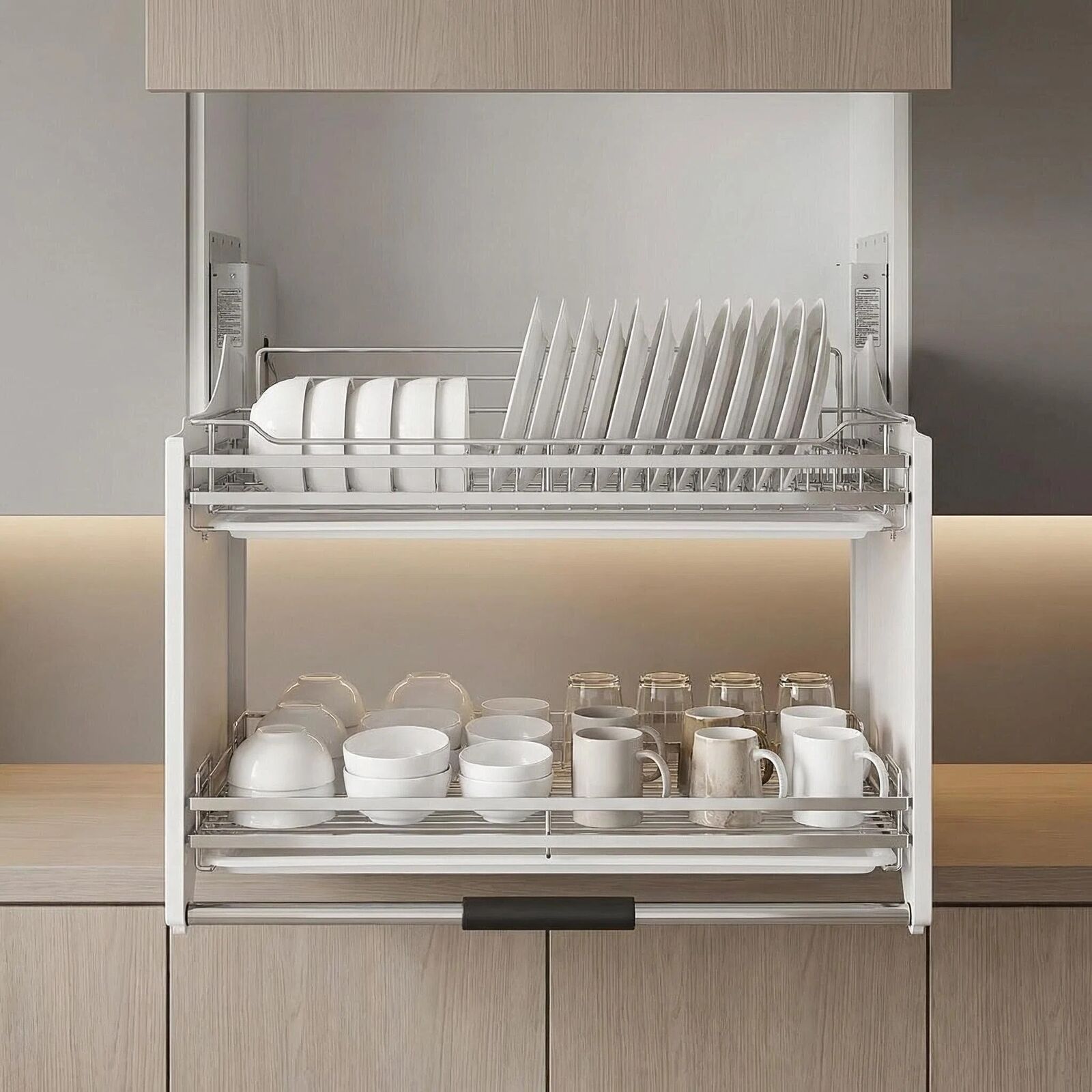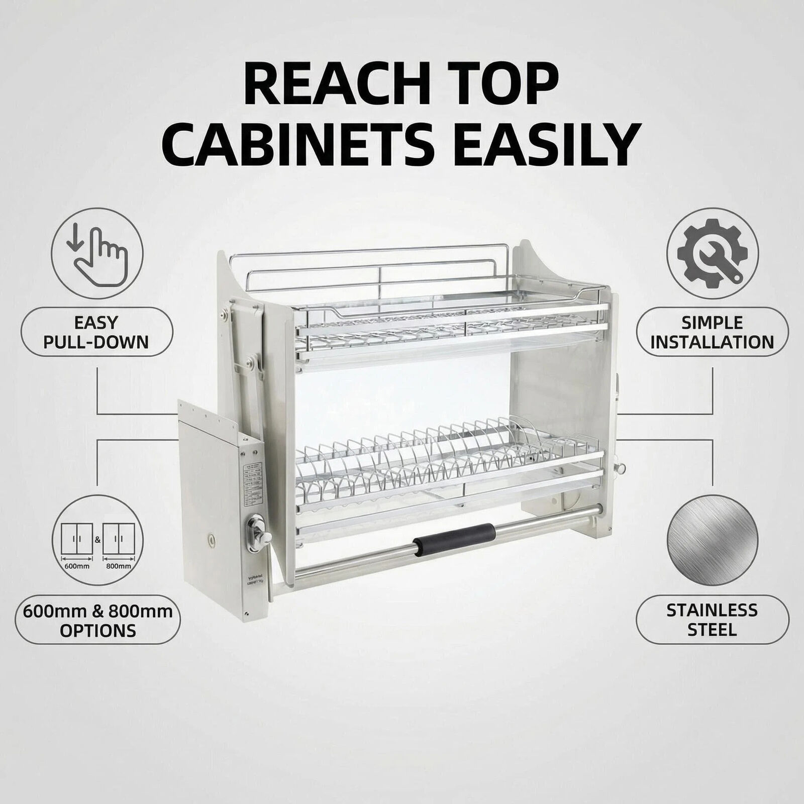 Its smooth hydraulic pull-down mechanism brings dishes, mugs, bowls, and other kitchen essentials directly to you, saving you from using step stools and improving your kitchen workflow. Ideal for busy families, elderly users, or anyone looking to optimize storage in high cabinets.