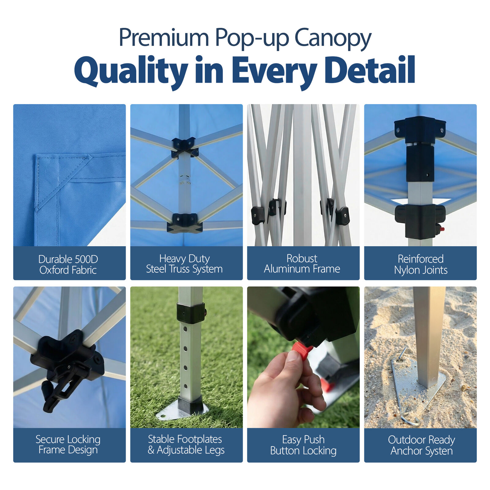 - Adjustable Height - The gazebo has a 3-stage height adjustment, allowing you to set it between 3.2m and 3.5m (approx. 10.5ft to 11.5ft). Whether for picnics, market stalls, or festivals, it’s adaptable to your needs.The design complies with Australian engineering standards.