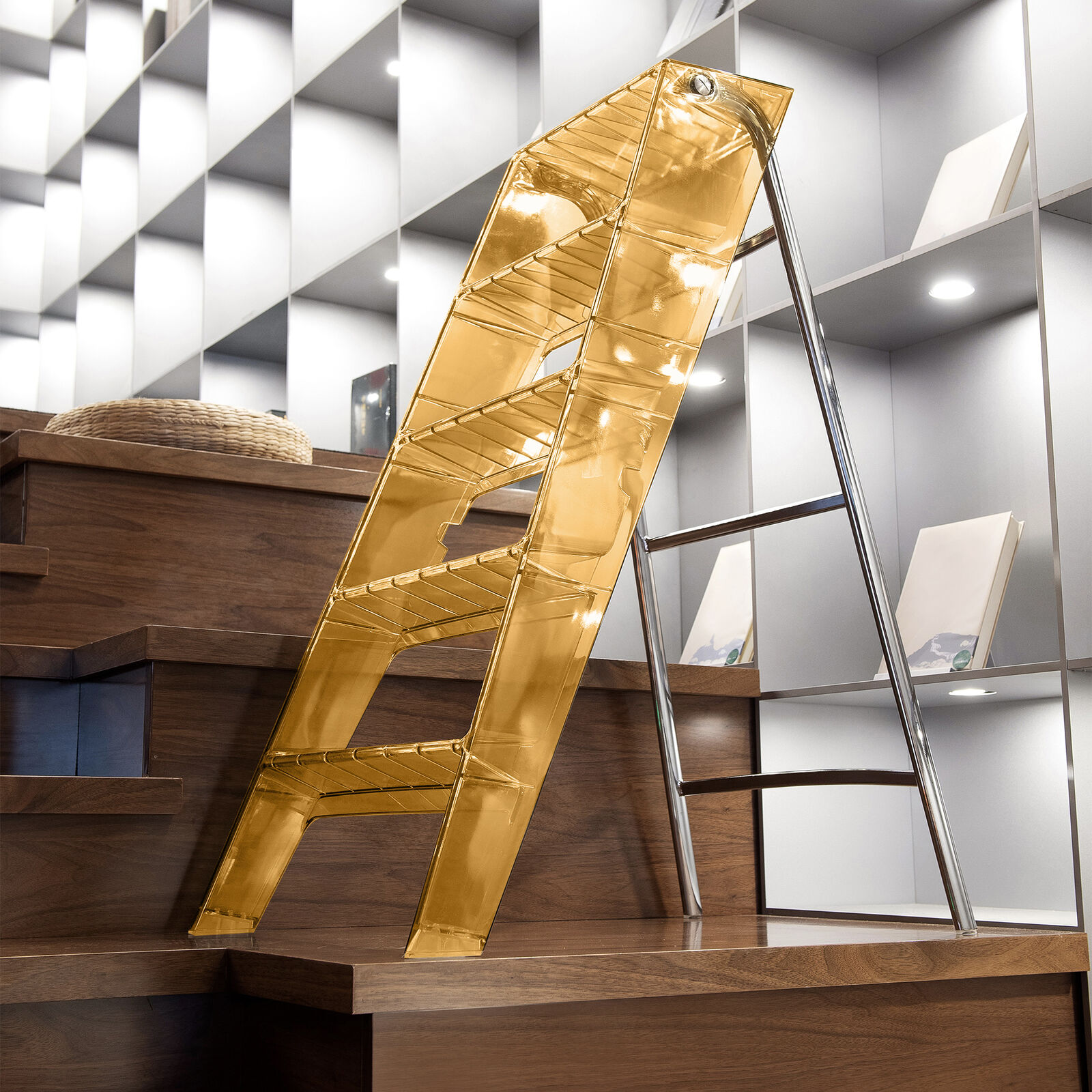 This 5-Step Folding Ladder perfectly blends style, convenience, and safety. Inspired by Kartell's iconic Upper step ladder, this piece features a sleek Nordic design, a sturdy metal structure, and transparent crystal accents. It folds effortlessly in one second, making it incredibly easy to store in any corner, wardrobe, or under the bed. With a load-bearing capacity of 150kg and stable triangular mechanics, it ensures a secure climbing experience. Lightweight at only 10 kg, it's easy to carry around the house or workplace. Versatile and practical, it’s ideal for use in kitchens, bathrooms, bedrooms, offices, and more. Use it as a step stool, dining stool, shelf, side table, decor, or even a stylish indoor flower stand.