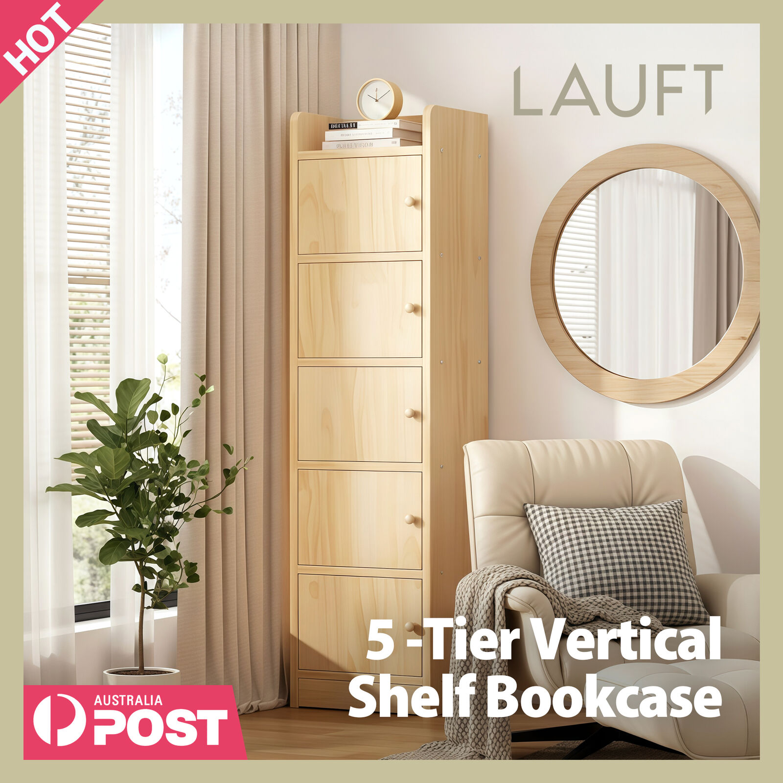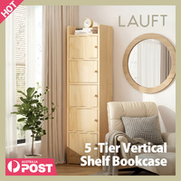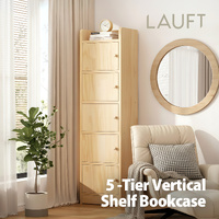 Lauft 5-Tier Natural Bamboo Wooden Bookshelf, Slim Vertical Bookcase Organizer, Flat Top & Cube Disp