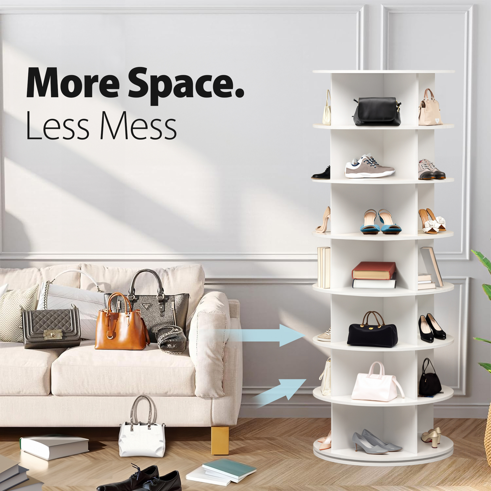 • Space Optimization - Our Vertical Rotating Display Stand maximises your space by vertically organising your shoes, bags, or books, freeing up valuable floor space for other activities or furniture arrangements.