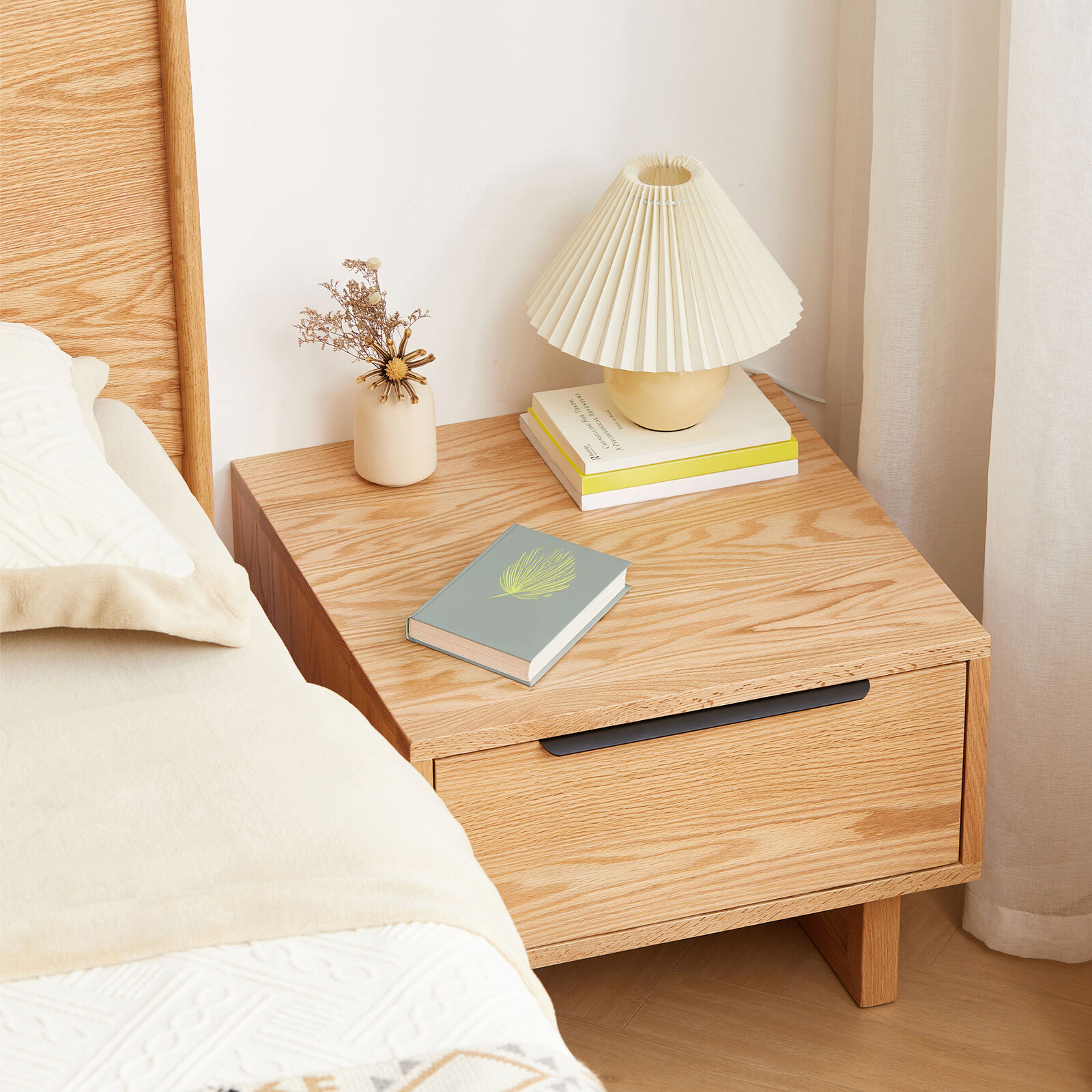 MIUZ American Solid Oak Wood Bedside Table, Side Storage End Table w/ Drawer, Minimalist Nightstand