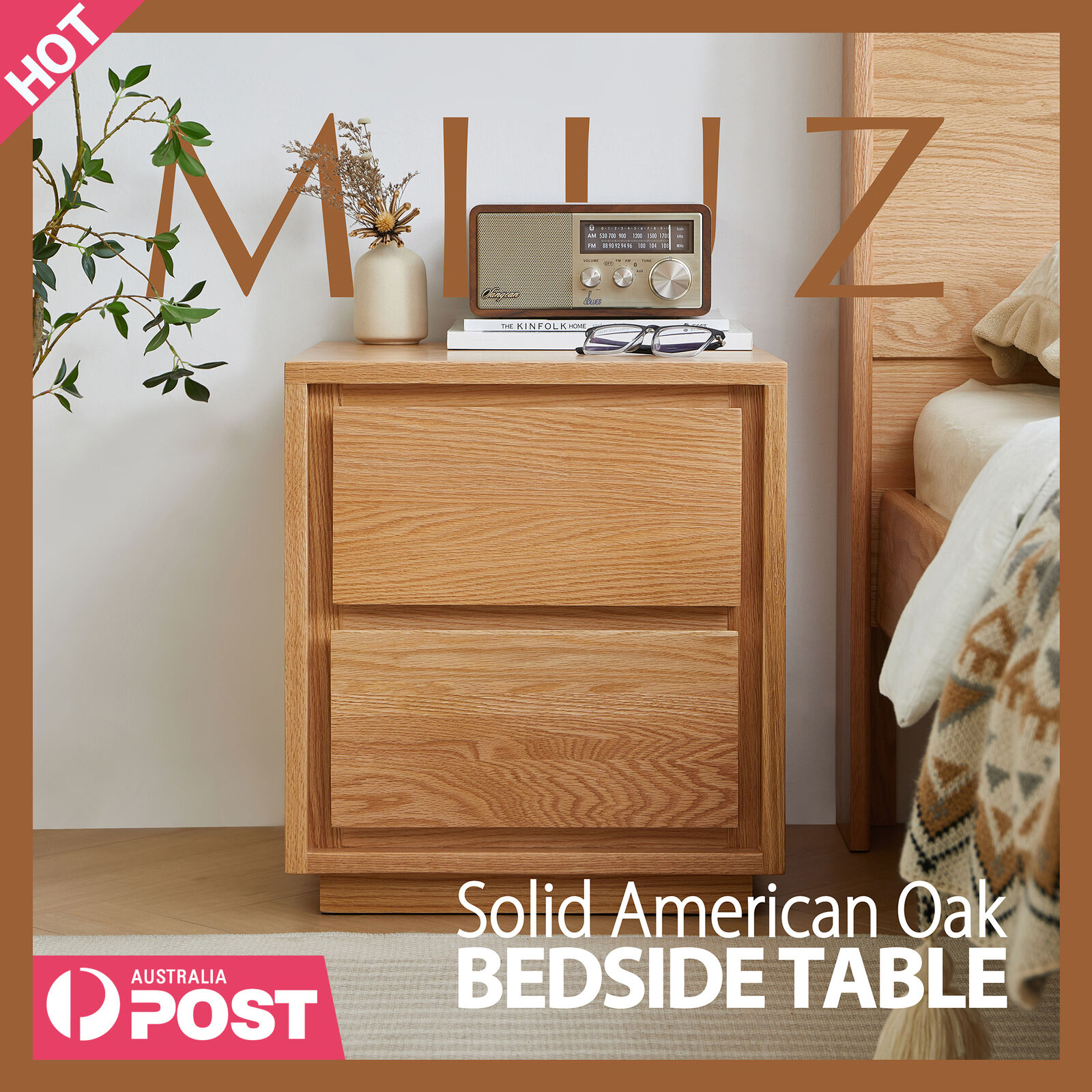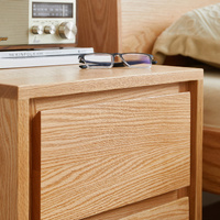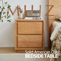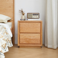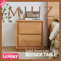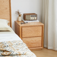 American Solid Oak Wood Bedside Table, Side Storage End Table w/ 2 Drawers, Natural Wood Finish Organizer, Minimalist Nightstand w/ Tapered Legs