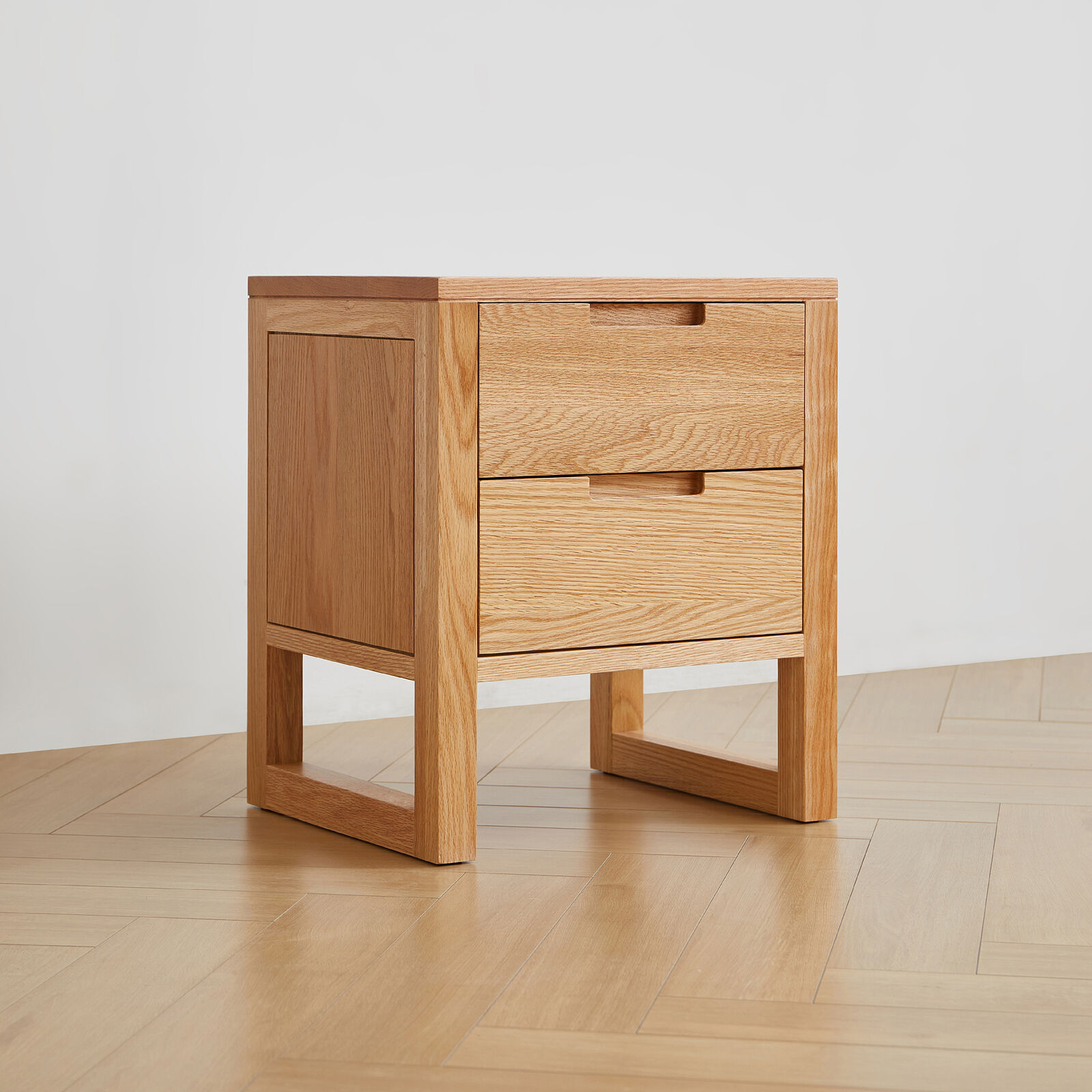 Upgrade your bedroom with the Modern Bedside Table, crafted from American Solid Oak Wood. Featuring a warm oak finish, cut-out handles, and two spacious drawers, it blends minimalist style with practical storage. The open rectangular base adds visual lightness and easy floor access, making it perfect for bedrooms, guest rooms, or apartments.