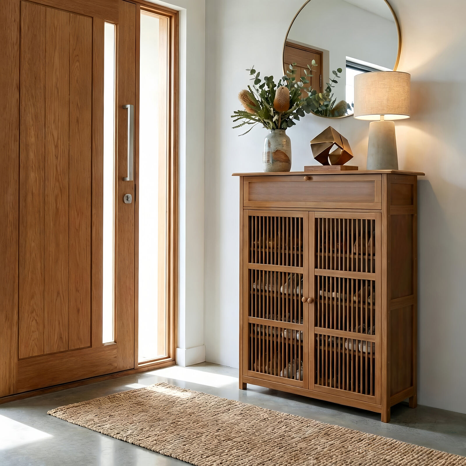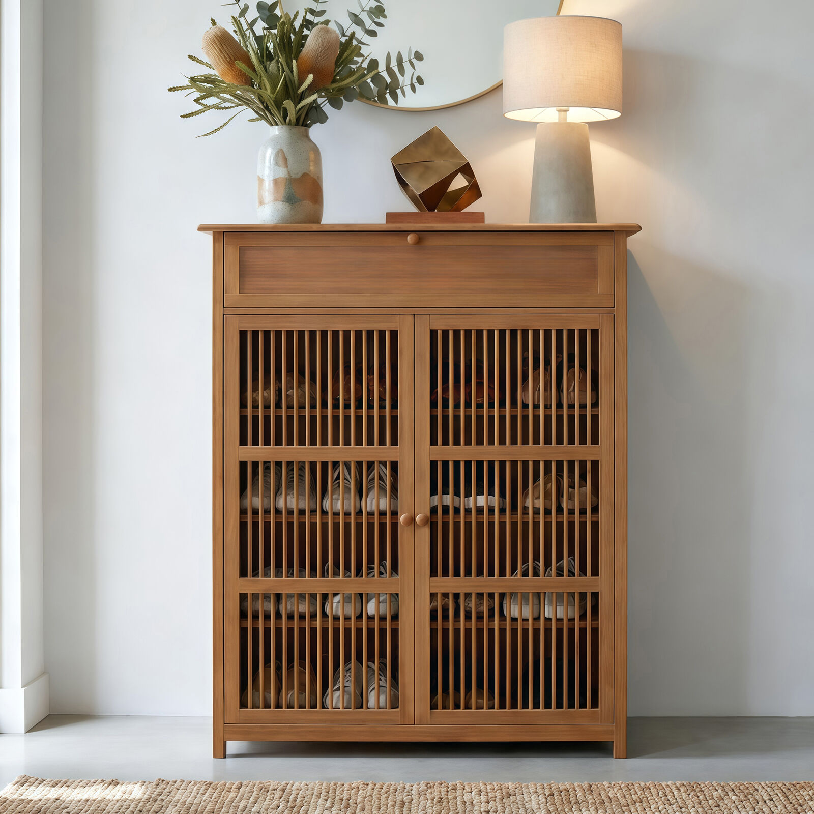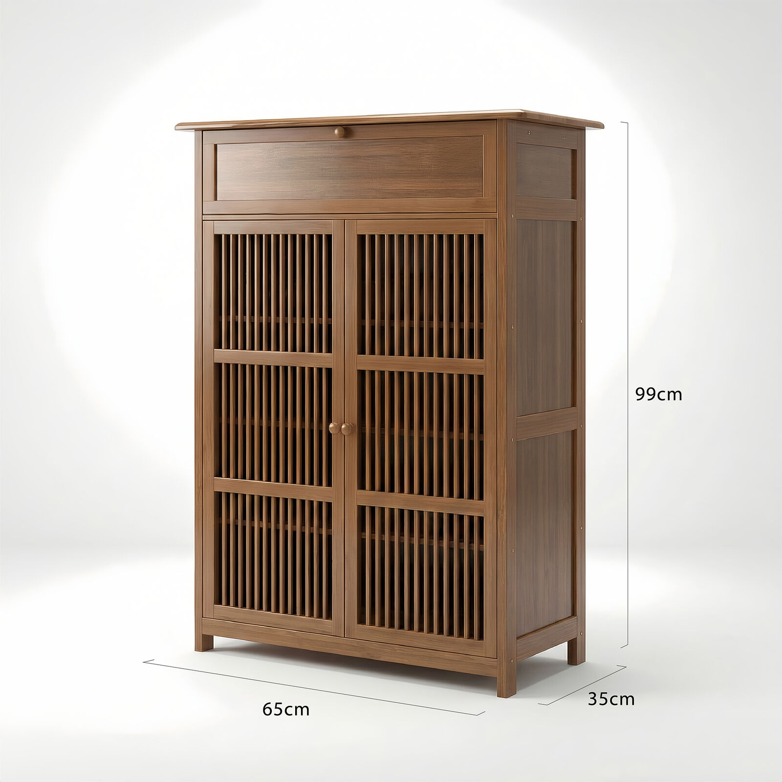 - 2-Door Shoe Storage Cabinet - Compact, space-saving design ideal for smaller spaces, featuring ventilated slatted bamboo doors that promote airflow and help keep footwear fresh and organised.