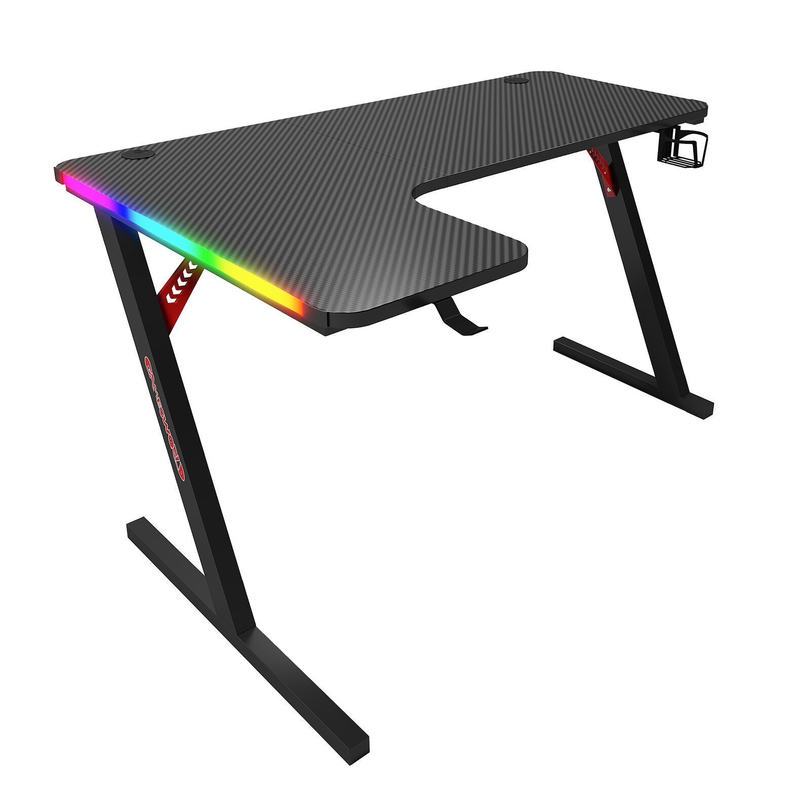 Level up your workspace with a modern computer desk built for style, comfort and everyday versatility. Whether you're working, gaming or studying, this versatile desk fits seamlessly into any interior style from minimalist setups to fully equipped workstations. Built with a carbon fiber finish and a reinforced metal frame, it offers a spacious desktop ideal for monitors, laptops and accessories. Its smart design suits compact areas and can be configured to maximise corner space. Clean lines, a sleek surface and integrated RGB light strips provide both visual appeal and an immersive gaming experience.