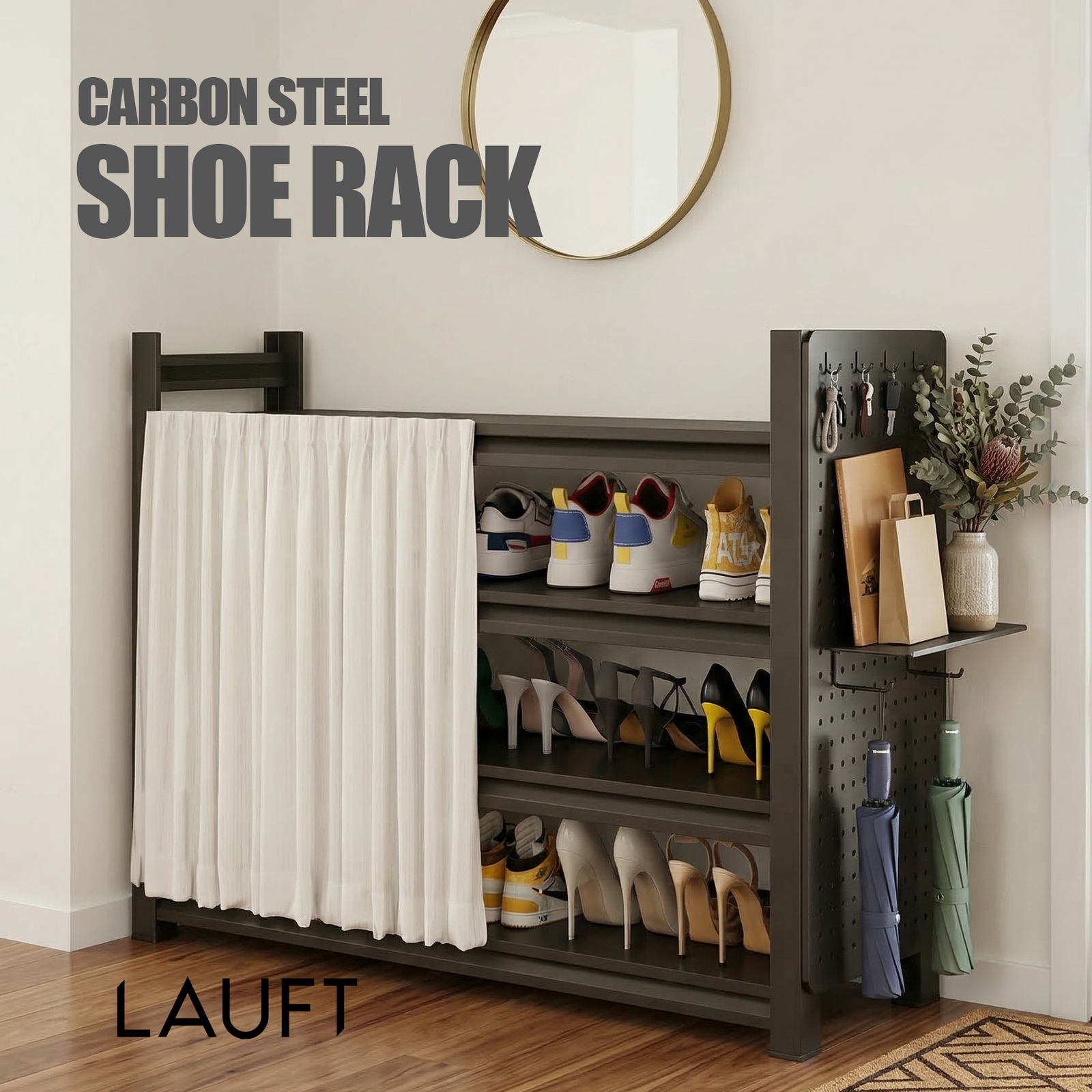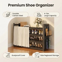 Lauft Black 4-Tier Carbon Steel Shoe Rack Organiser | With Dustproof Curtain & Pegboard | 100cm Wide