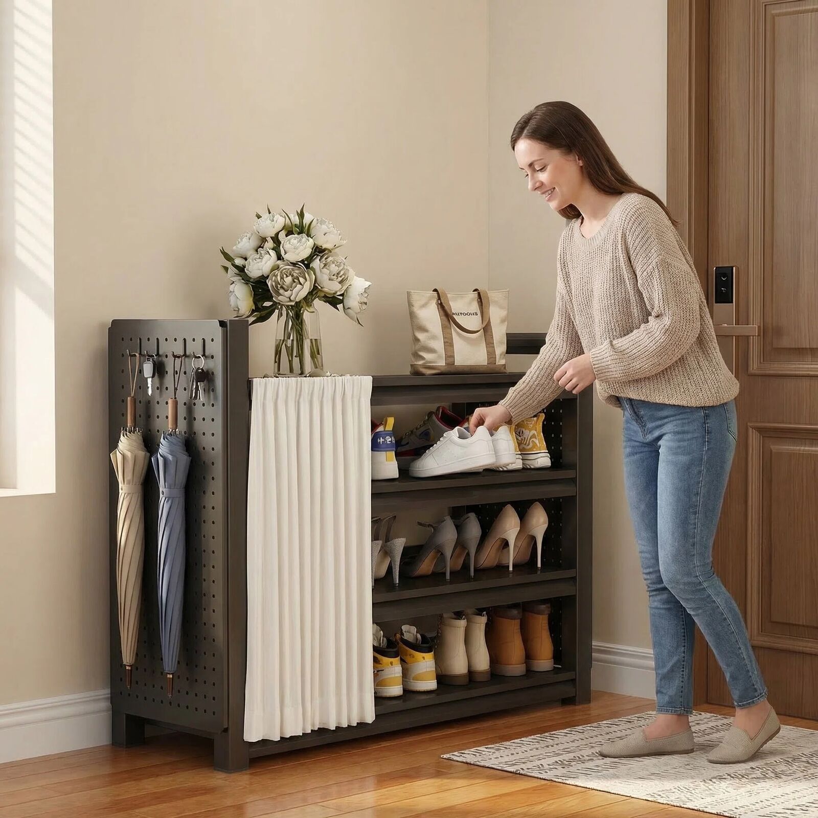 - INTEGRATED SIDE PEGBOARD SYSTEM More than just a shoe rack-its a complete home organisation station. The innovative side pegboard includes hooks for keys, dog leashes, and hats, plus dedicated slots for umbrellas and tote bags, keeping all your "out-the-door" essentials in one tidy place.