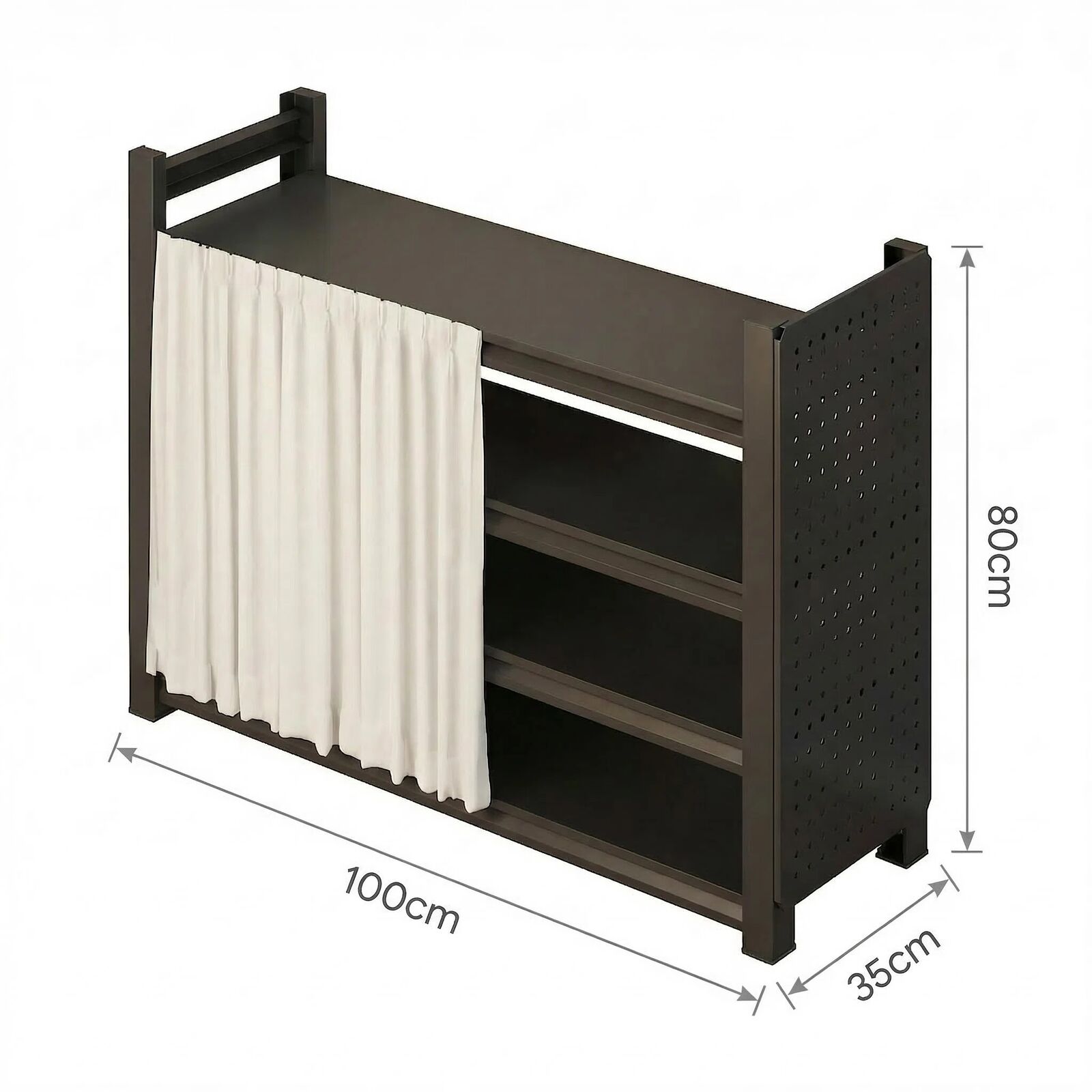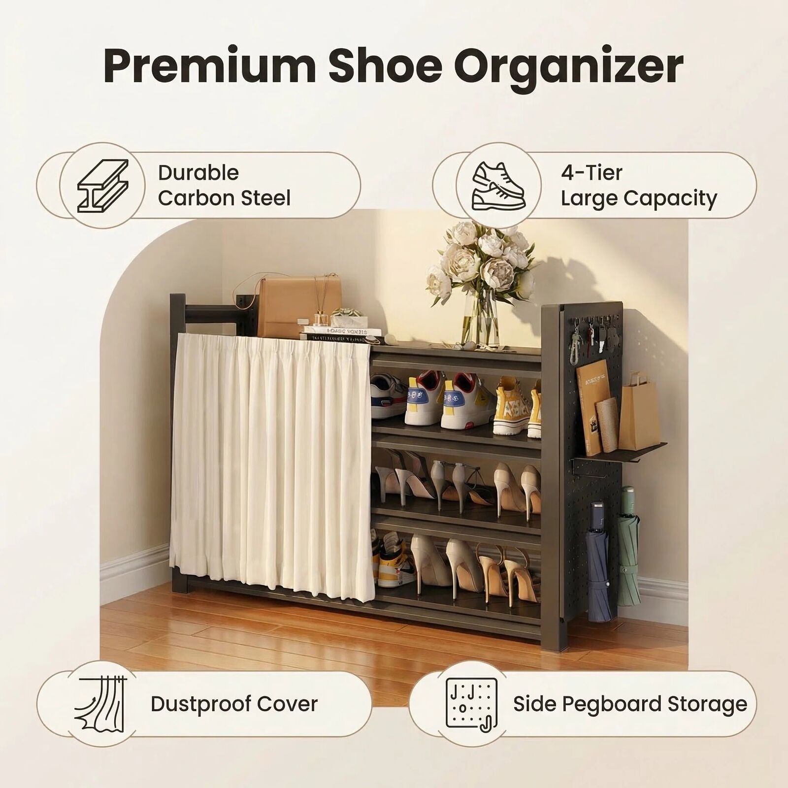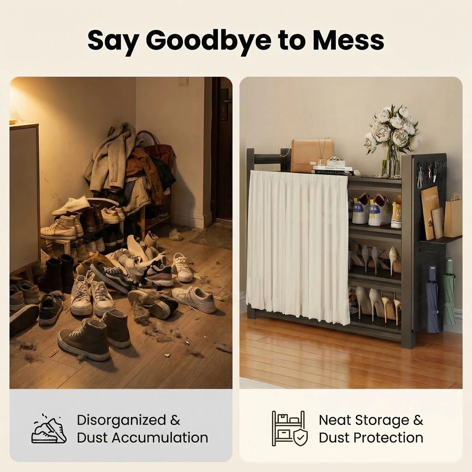 - DUSTPROOF SLIDING CURTAIN Keep your footwear pristine and your home looking elegant. The smooth-sliding white curtain provides instant concealment, hiding shoe clutter from guests and protecting your favourite pairs from dust accumulation. Designed for easy, tool-free assembly.