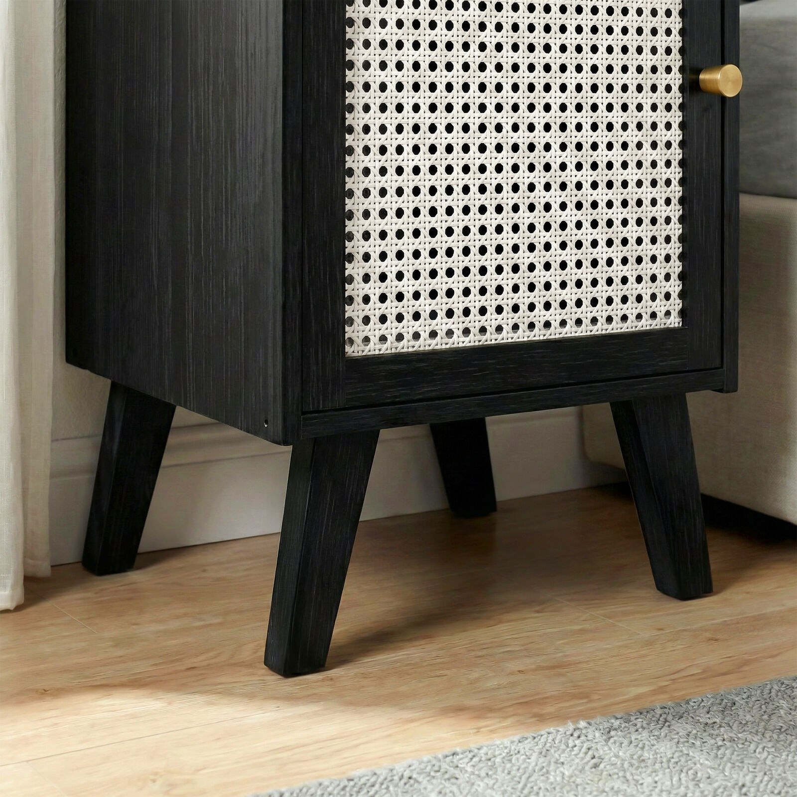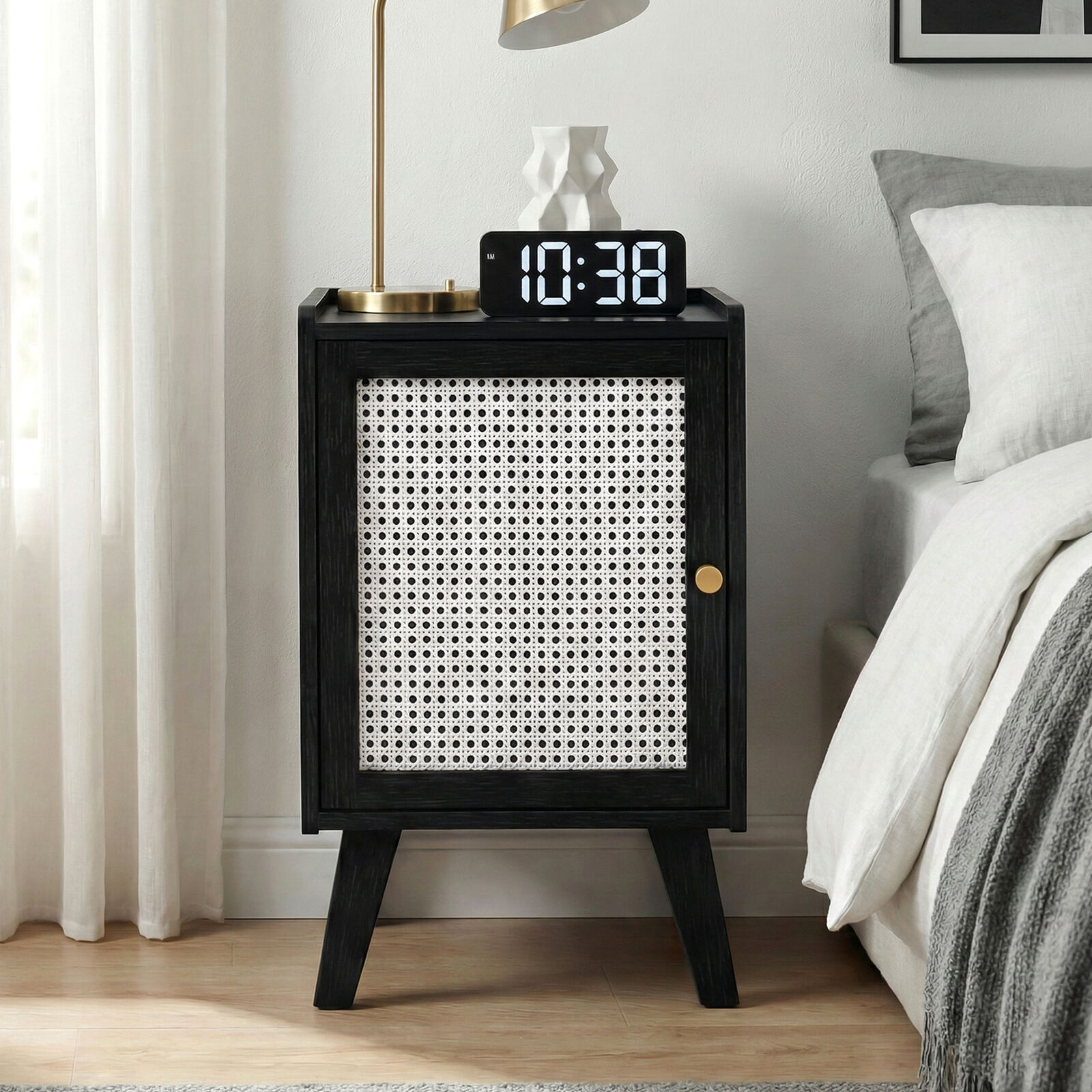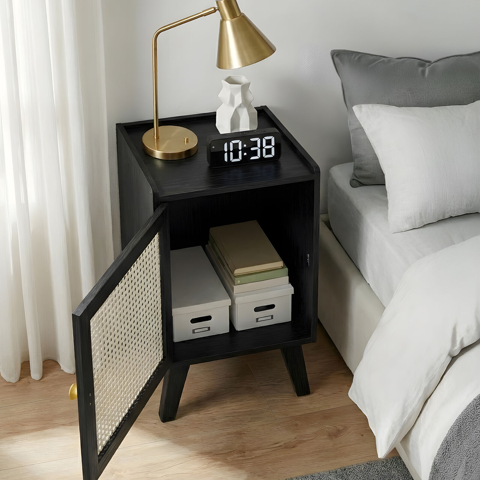 Add natural charm to your space with the Black Bamboo Wood Bedside Table. Crafted from durable bamboo wood, this stylish nightstand features a rattan-inspired door, a sturdy build, and a spacious storage compartment. Compact yet functional, its ideal for bedrooms, apartments, and cozy living areas. With its clean, modern design and elevated legs, this bedside table is both practical and decorative-an ideal addition to any home.