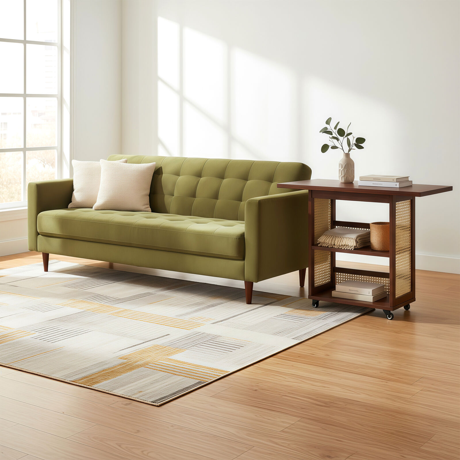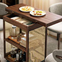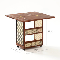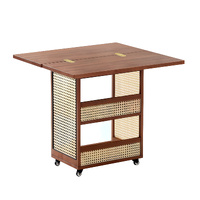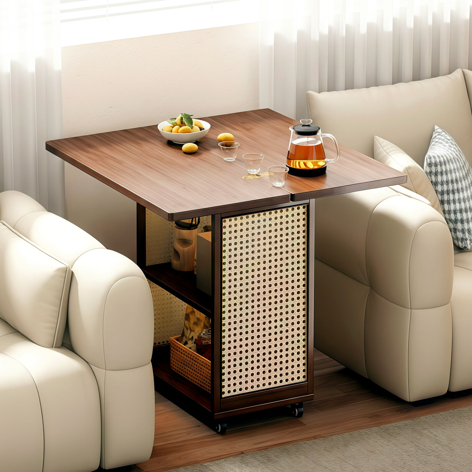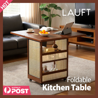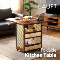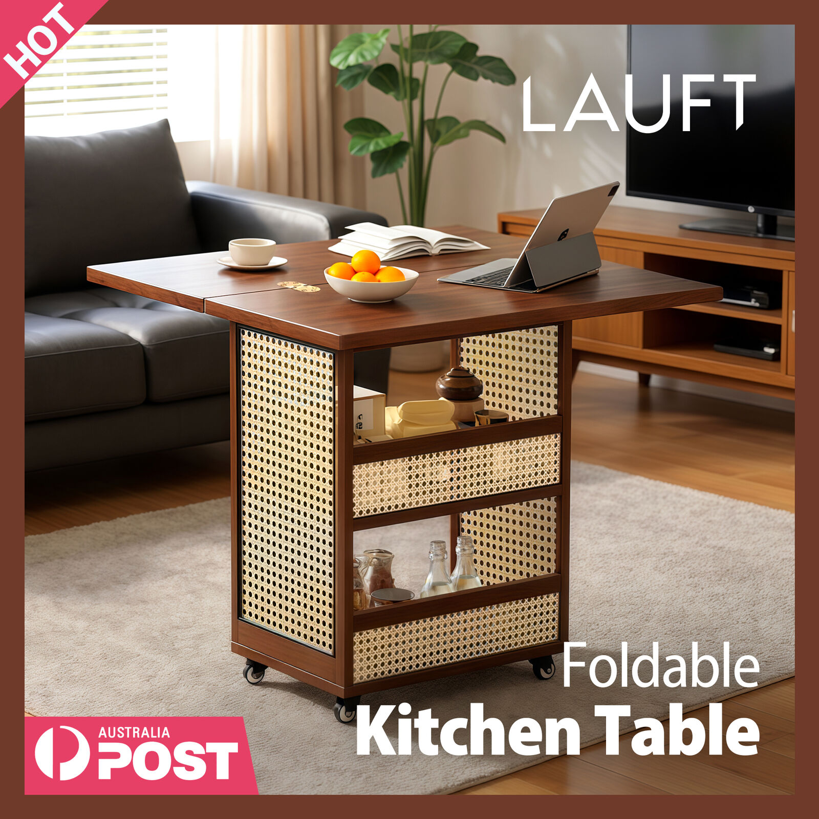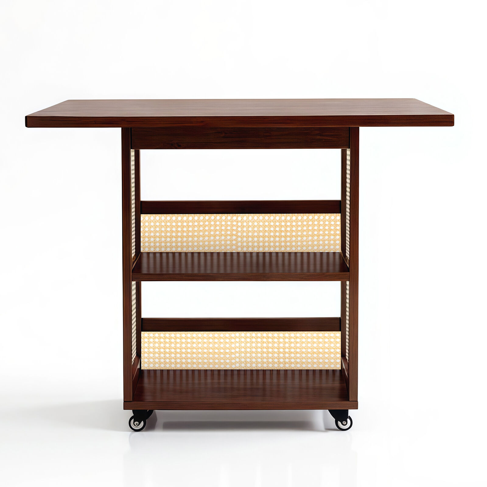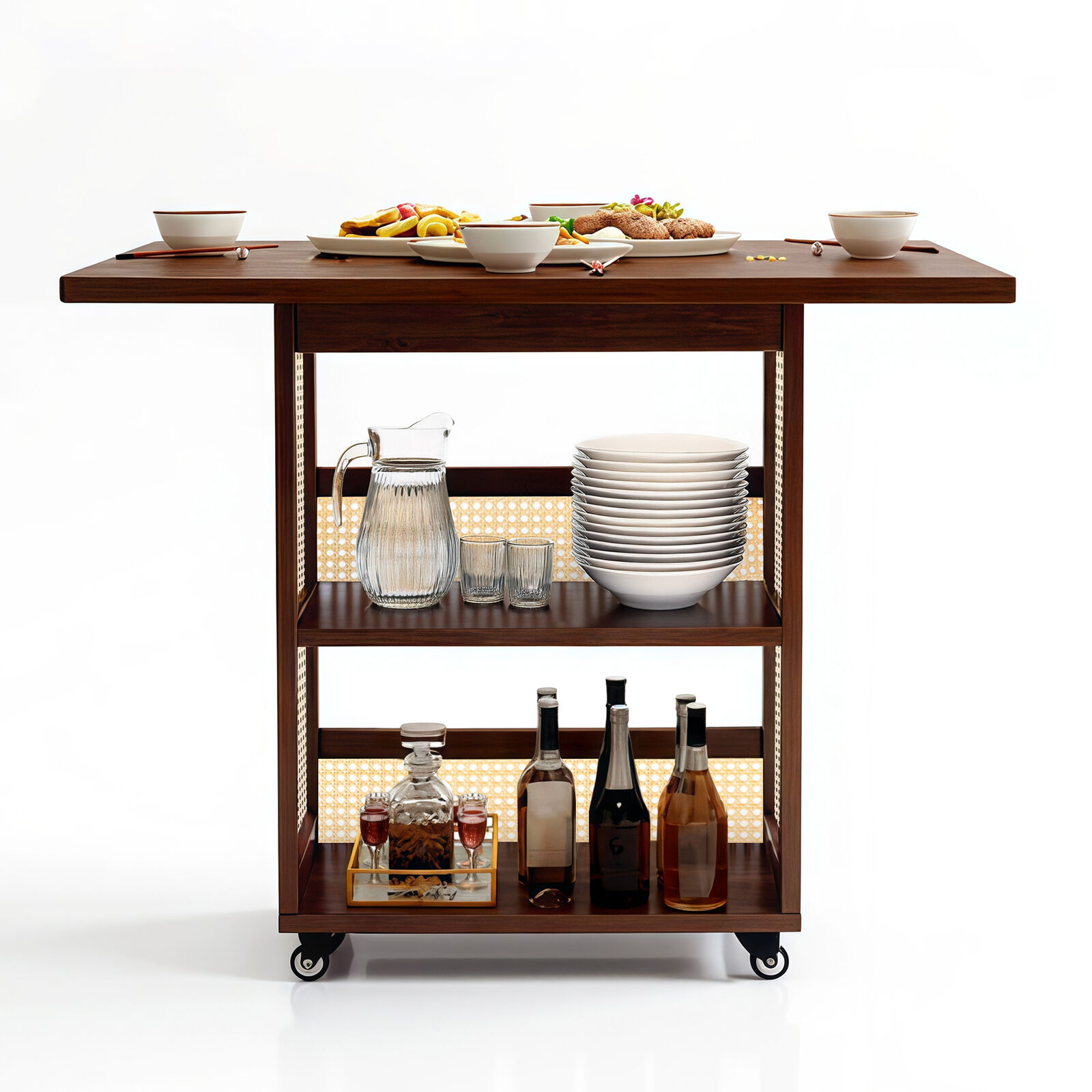 Save space in style with this multifunctional folding kitchen table. Crafted from mindfully sourced bamboo wood with elegant rattan-style panels, it brings a warm, modern touch to any room. The foldable tabletop easily adjusts for dining, working, or entertaining, while built-in storage shelves keep essentials organized and within reach. Smooth caster wheels make it easy to move wherever you need it, making it perfect as a dining table, bar cart, or mobile workstation for compact living spaces.