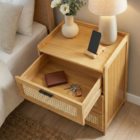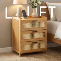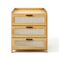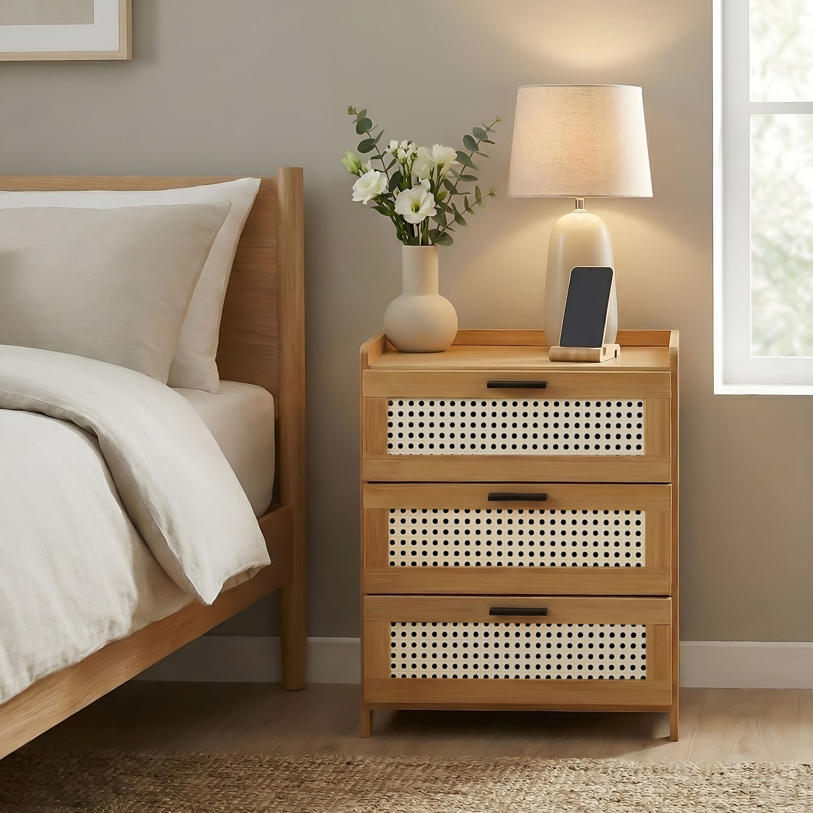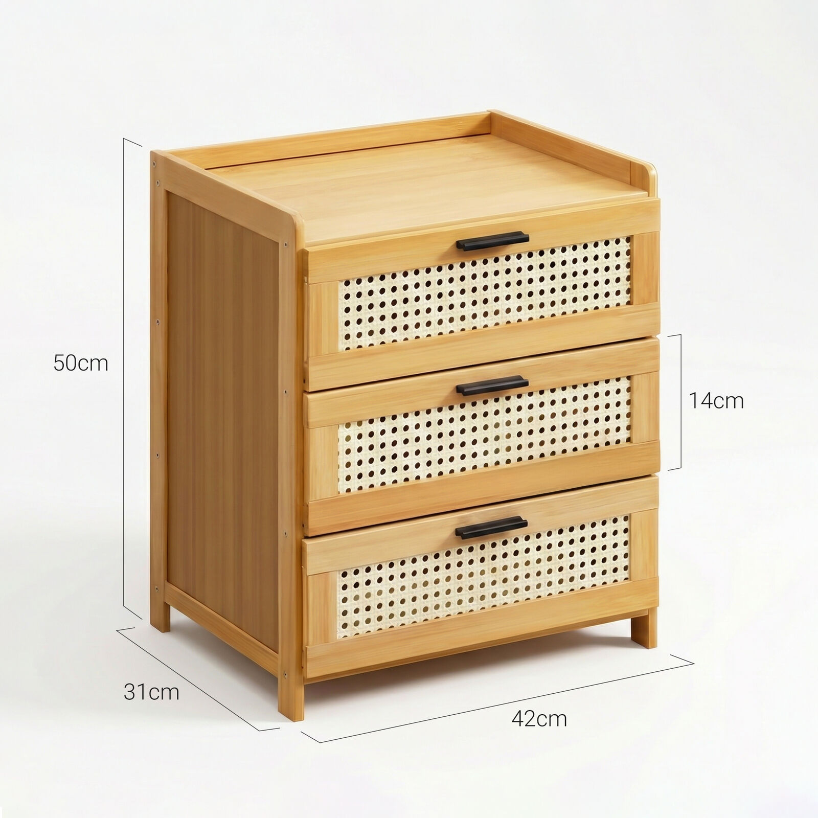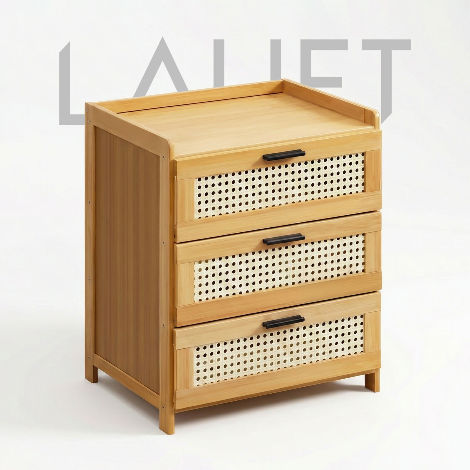 Lauft Natural Bamboo Wood 3-Drawer Door Rattan-Inspired Bedside Table, Chest Cabinet End Side Table,