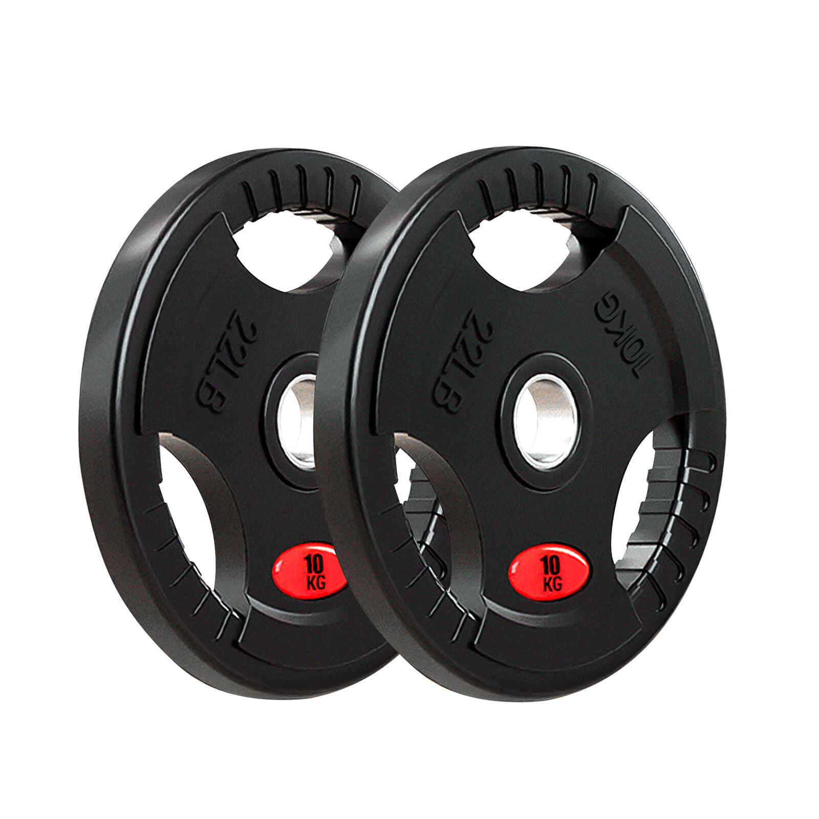 Weight plates come in 5kg / 11lb (4 pack), 10kg / 22.0flb (2 pack), 15kg / 33.07lb (2 pack) and 20kg / 44.1lb variations.