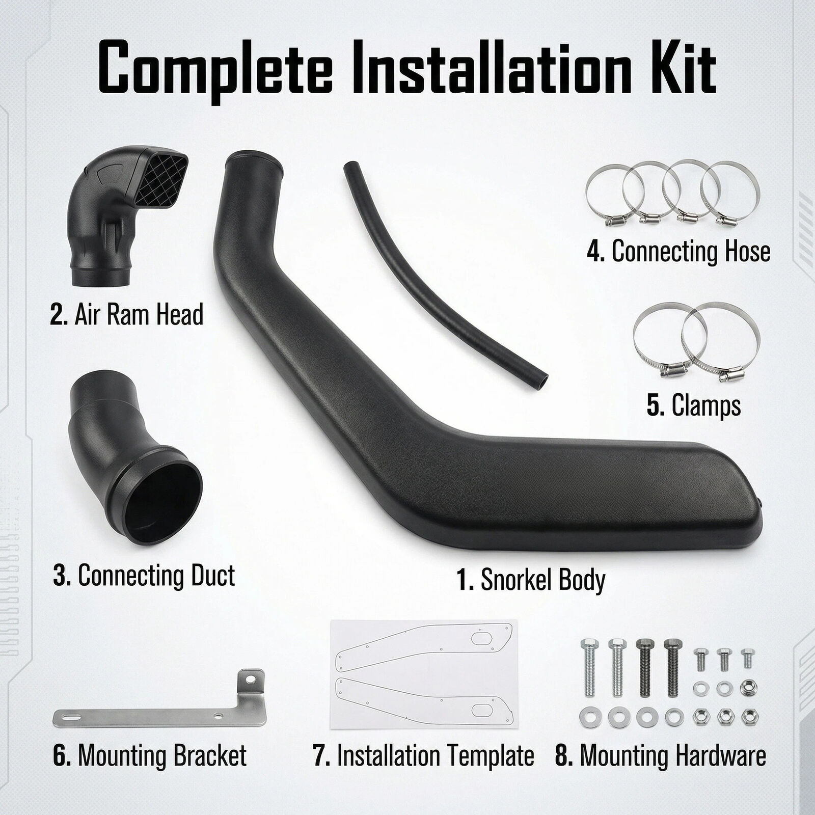 Snorkel Body, Air Ram Head, Intermediate Connecting Duct, Full Mounting Hardware Kit (Studs, Nyloc Nuts, Washers), Heavy-Duty Stainless Steel Clamps, Custom Mounting Bracket, Precision Cutting Template