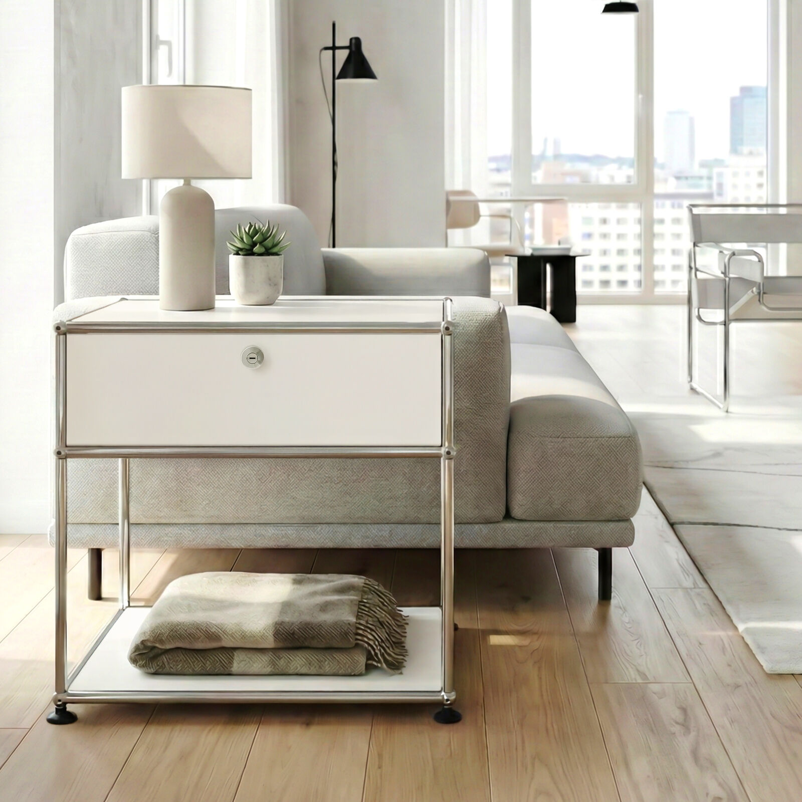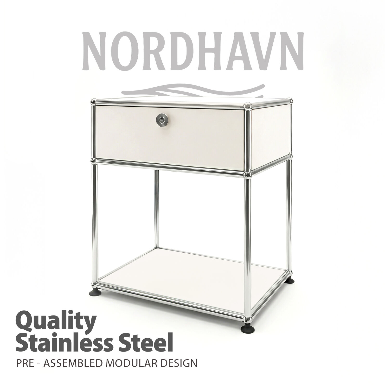 Nordhavn Stainless Steel White Bedside Table , Pre Assembled End Table, Modern Night Stand Steel Fra